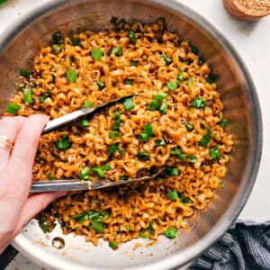 • Add the noodles to the skillet, remove from heat, and toss until evenly coated in the sauce.