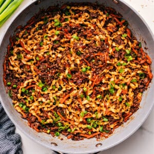 With a couple of packets left, half a pound of ground beef, and some sad-looking carrots in the fridge, I threw together these quick beef noodle bowls. Little did I know my whole family would go wild for it! I think it’s safe to say this one just dethroned their favorite udon stir-fry.