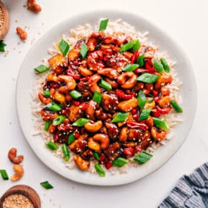 This Cashew Chicken Recipe is quick, simple, and full of flavor with tender chicken, sautéed peppers, crunchy cashews, and a delicious stir-fry sauce.