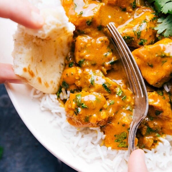 - Combine and Serve: Mix chicken into sauce and serve with rice and naan.