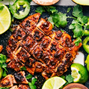 - Remove from oven, tent with foil, and let rest for 5–10 minutes. Brush pan juices on top. Drizzle generously with fresh lime juice. Slice or chop as desired.