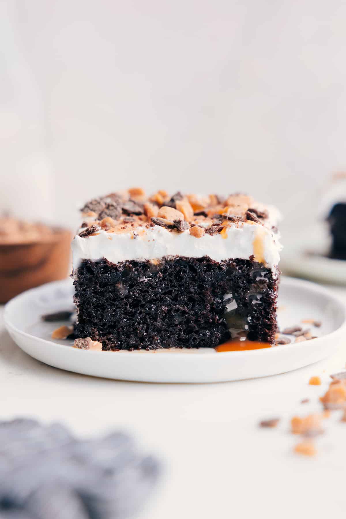 Chocolate Poke Cake is a super-moist chocolate cake with a caramel soak and finished with whipped topping and toffee.