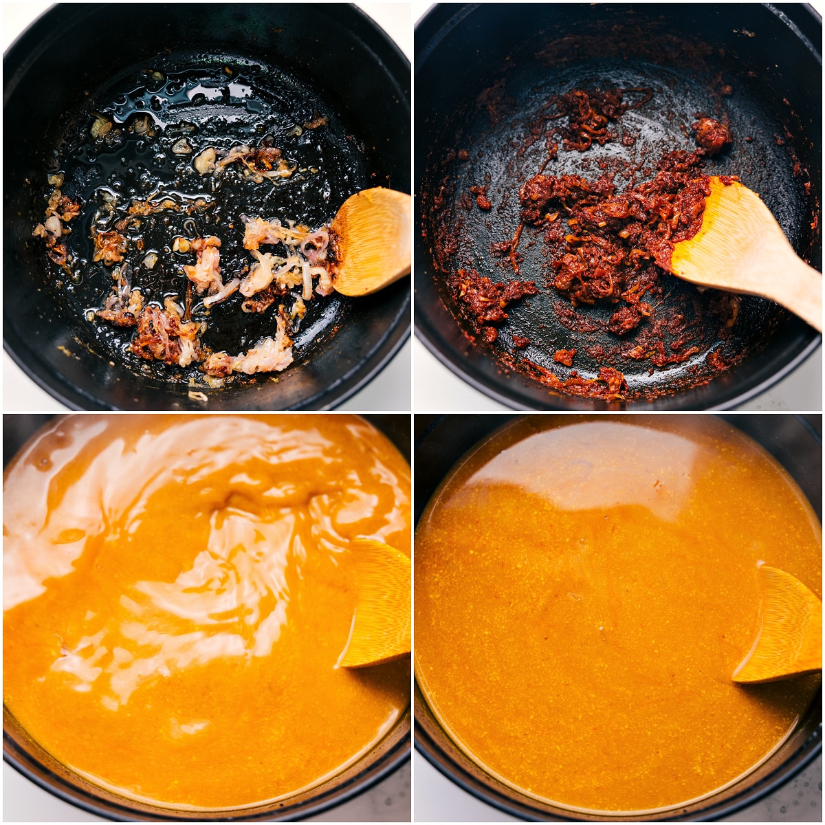 - Once the shallots are golden, add in curry paste and powder. Stir constantly for 2–4 minutes or until very fragrant—don’t rush this; we’re creating the foundation of flavor. Increase heat to medium high, and while stirring constantly and scraping the bottom of the pot, gradually add in 1 cup of chicken stock until incorporated. Add in the rest of the chicken stock and the coconut milk. Stir until smooth.
