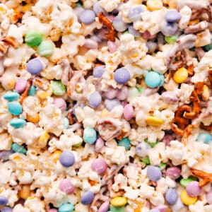 Easter Popcorn is a sweet and salty mix of popcorn, pretzels, pastel M&M’s, and creamy white chocolate that’s bright, festive, and seriously hard to stop snacking on!