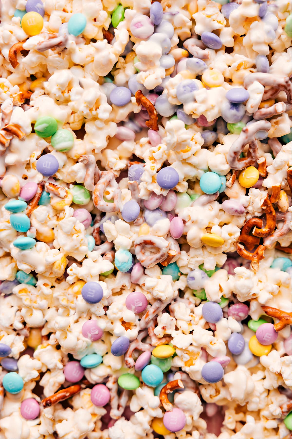Easter Popcorn is a sweet and salty mix of popcorn, pretzels, pastel M&M’s, and creamy white chocolate that’s bright, festive, and seriously hard to stop snacking on!