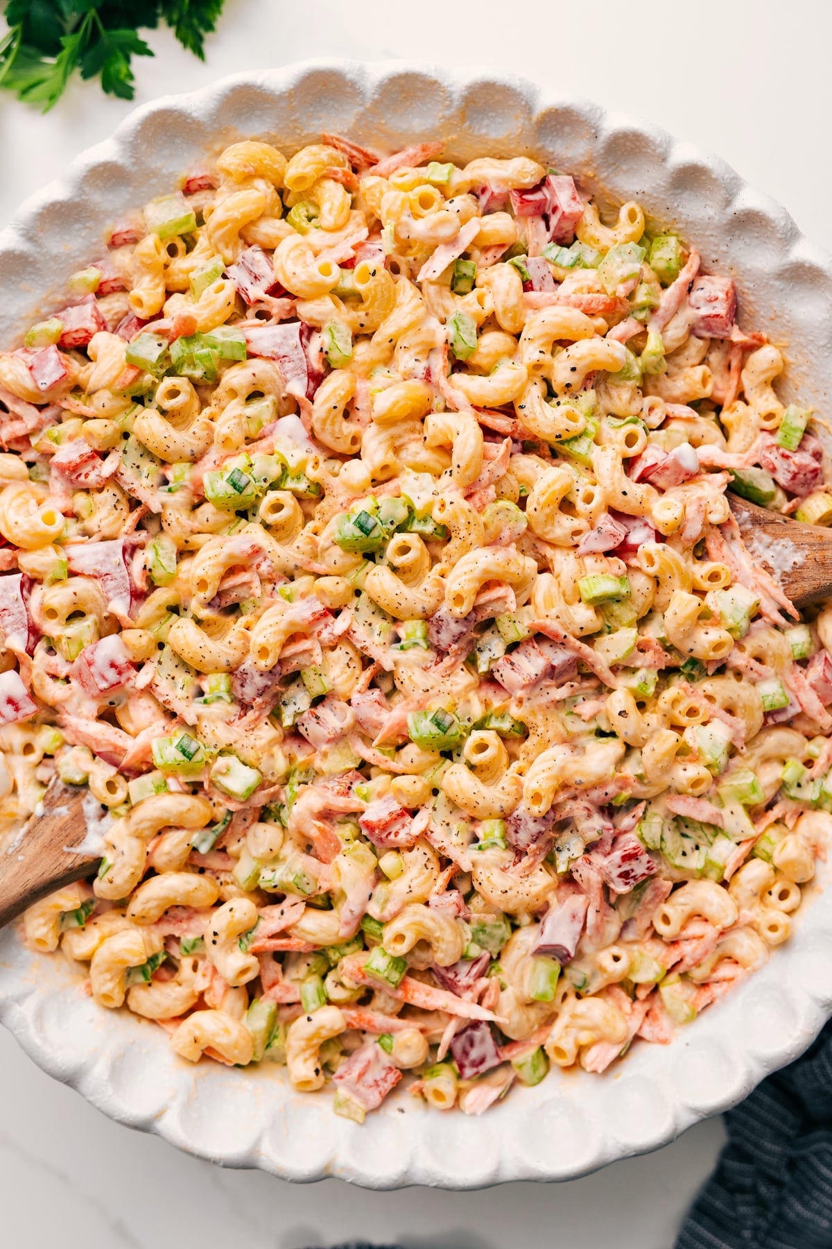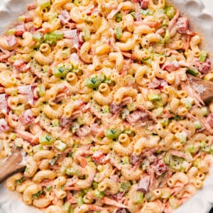 And this macaroni salad? It never leaves the rotation. It’s so dang good. Super creamy, a little sweet, a little tangy, and packed with all the best mix-ins.