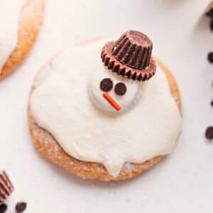 Melted Snowman Cookies turn soft peanut butter cookies into adorable little snowmen with creamy white chocolate “snow” and mini peanut butter cup heads for the cutest, tastiest winter treat.