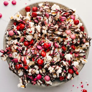 - While the chocolate is still soft, gently press the remaining M&M’s into the popcorn. Sprinkle with Valentine’s sprinkles, if using.