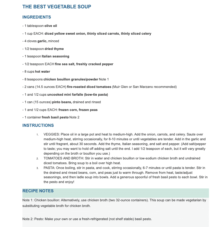 This is not the same recipe as the picture and not the one I’ve fixed before of the best vegetable soup ever, that one had bow tie pasta and pintos and corn and peas . How do I find that recipe of yours ? My family loved it and I pinned it but now it’s the same picture with totally different recipe.