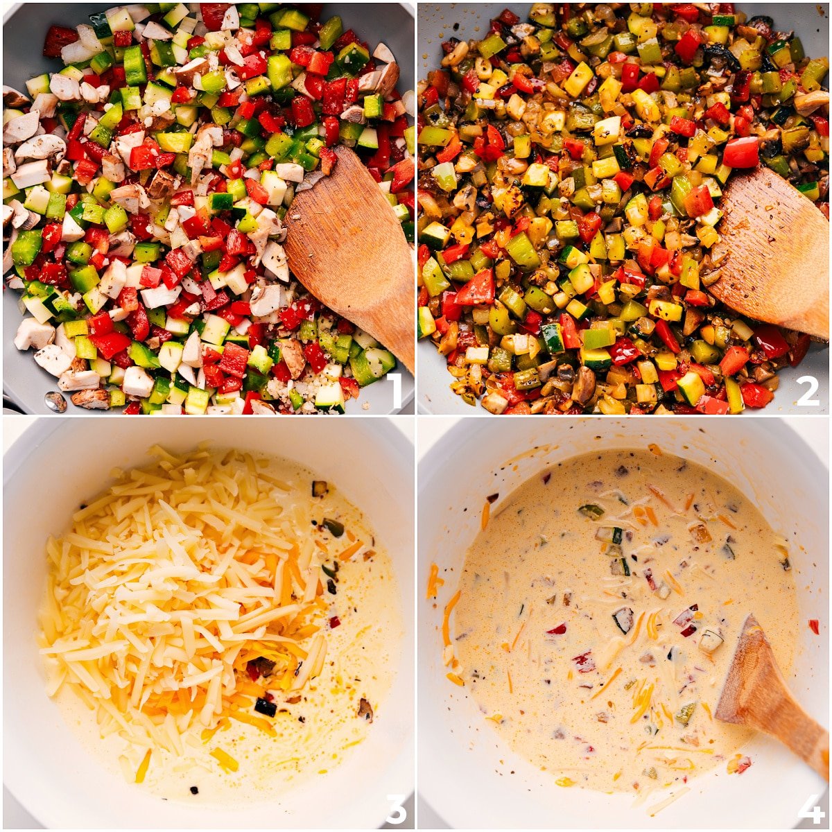 - Heat olive oil & butter in a large nonstick skillet over medium heat. Add the onion, bell peppers, mushrooms, and zucchini. Season (I add 3/4 tsp salt & 1/4 tsp pepper). Cook, stirring often, until the veggies soften and excess moisture cooks off, about 8 to 10 minutes. Add garlic in the last minute. Remove from heat and let cool slightly.