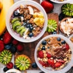 Note 1: Consistency is key. The more frozen your ingredients are, the thicker your bowl will be. Note 2: To freeze bananas, use slightly overripe ones for more flavor. Peel, slice into 1-inch pieces, and space on a parchment-lined tray to freeze. Then, store in freezer bags (lasts 3-4 months). Use straight from freezer.Note 3: If you don't add honey on top, I recommend adding it to the mixture beforehandNote 4: It's important to use a high-powered blender. Less powerful blenders will struggle to crush the frozen fruits and by the time it does, it won't be as thick.Storage: Once blended, bowls are best eaten immediately. They don't store well.Nutrition Note: Nutrition information does not include the optional toppings.Additional Bowl Recipes: