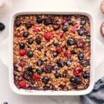 Note 1: Any milk works. Whole milk makes it richer while almond milk keeps it lighter.Note 2: Use pure maple syrup, not pancake syrup. This recipe is already fairly sweet, so feel free to slightly reduce the maple syrup. You can always drizzle more on top when serving.Note 3: Quick oats and steel-cut oats won’t work properly in this recipe. Note 4: Use whatever berry (or combo of berries) you like best. Only use fresh berries. Frozen berries affect the texture and make the baked oats watery and less flavorful.Note 5: For serving, top with milk or coffee creamer, additional maple syrup, or any leftover berries!Make this Baked Oatmeal your own! Make this Baked Oatmeal your own. Bake a little less for softer oats or a little longer for firmer bars that cut cleaner. Reduce the maple syrup for less sweetness or drizzle more on top after baking. Enjoy it warm, at room temperature, or chilled.Storage: Store cooled baked oatmeal in an airtight container in the fridge for up to 4 days. Reheat individual pieces and add a splash of milk or syrup if needed.