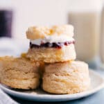 Set biscuits close together on sheet pan, about 1/2-inches apart. (Rising close together helps them rise straight up.) Brush the tops with remaining 2 tablespoons heavy cream. Refrigerate 20 minutes. Bake 12–16 minutes or until lightly browned on the bottoms and tops. Remove and let stand 10 minutes. (Steam will finish cooking the interior.) Out of the oven, brush on some softened butter with a pastry brush if desired. Serve warm, split in half with butter and jam, or even some cream if you’re feeling fancy!