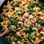Note 1: If you can’t find orecchiette pasta, use fusili, farfalle, medium shells, or penne.Note 2: Italian sausage: The better the sausage, the better this dish tastes! Remove the casings before cooking. Choose either mild or spicy sausage—either works and both are delicious. If some of your guests want more spice and others don’t, serve red pepper flakes on the side!Note 3: Use a block of Parmesan and grate it on the small holes of a grater. Alternatively, use finely grated Parmesan cheese. Parmesan from the can will be too salty and won’t melt into the sauce nicely.Note 4: Emulsifying combines ingredients so they stay mixed, unlike a separated mixture. Toss the sauce until it clings to the pasta, adding reserved pasta water if needed for a smooth, even coating.Storage:As with most pasta dishes, this recipe is best enjoyed immediately. When reheating, you’ll likely need to add a splash more chicken broth to thin the sauce again. This dish doesn’t freeze/thaw well.