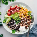 Note 1: Recipe timing and seasoning quantities are based on using 2 medium-sized chicken breasts, each weighing 1/2 pound, for a total of 1 pound of chicken.Note 2: Sauté frozen corn in butter or oil before adding. See Black Bean Burrito Bowls recipe for detailed instructions.Note 3: I love to use sour cream, Cotija cheese, jalapenos, lime, cilantro, pickled red onions, and cilantro-lime sauce or taco sauce. For quicker toppings, grab store-bought salsa,pico de gallo, guacamole packs, and cilantro-lime sauce.Storage: Store the rice, chicken, and toppings in separate containers in the fridge; they will stay fresh for up to 4 days. The sauce will last a week in the fridge. When ready to eat, reheat the chicken and rice, then add the toppings and sauce.