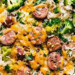 Cheesy Chicken, Broccoli, and Rice combines Italian-seasoned chicken sausage with roasted broccoli, onions, tender rice, and melty Cheddar cheese. Using minimal ingredients and cooked on one sheet pan, it’s sure to be a family favorite!
