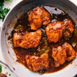 Note 1: My friend uses a whole head of garlic. I like a little less, but feel free to use more or less to taste.Note 2: Do not use chicken breasts. The fat in thighs is needed for the sauce to reduce into a rich glaze.Storage: Store cooled chicken and sauce in an airtight container in the fridge for up to 3 days. Reheat gently on the stovetop or in the microwave, adding a splash of water if needed.
