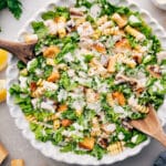 Note 1: Use leftover or store-bought grilled chicken or rotisserie chicken.Note 2: Use a block of Parmesan and grate it with a microplane for the best texture and accurate measurement.Storage: Best eaten right after mixing. For meal prep, store pasta, chicken, lettuce, and dressing separately. Add croutons last to keep them crisp.