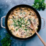 Add in the chopped chicken, uncooked gnocchi, mushroom and onion mixture, and coarsely chopped spinach. Stir until everything is coated in cream sauce. Top with Parmesan cheese and place in the oven. Bake for 18–25 minutes. If desired, broil for 1–2 minutes for a delicious crispy top. Watch closely—it can go from perfect to burnt in a matter of seconds!