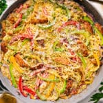 Add drained pasta and sautéed veggies to the skillet and toss to coat in the sauce. Taste and adjust with more lemon juice or salt. If needed, thin the sauce with reserved pasta water, starting with 1/4 cup. Slice or dice the chicken and arrange it on top. Finish with extra Parmesan and lemon wedges.