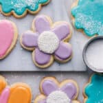 Note 1: The better the butter, the richer the flavor. I love Challenge® Butter. Use unsalted to have perfect control over the amount of salt in the dough. Do not melt or soften the butter; it’s important to have very cold butter so it can properly cream with the sugar.Note 2: These cookies benefit from vanilla bean paste; it adds even more flavor. That said, vanilla extract also works well—use pure vanilla extract for maximum flavor.Note 3: The amount of glaze in this recipe won’t cover all the cookies, but about 5–7 cookies (depending on the size). That said, the glaze works best in this quantity, and I like to make several batches and color different batches. If the glaze forms a slight skin over the top, just give it a good stir to remix.Note 4: If the dough has gotten really warm from working with it, place it all in the fridge to chill for about 30 minutes. It’s too warm if it won’t roll out nicely or lift well from the wax paper. Usually, if you use a hand mixer, you’ll need to chill it before working with it.Storage:One of my favorite things about this recipe is it can be made months in advance! Simply bake all the cookies and freeze them on a sheet pan in the freezer. Once frozen, transfer to an airtight container, separating layers of cookies with wax or parchment paper. Let cookies thaw at room temperature and frost them fresh. Freeze for 3–6 months.Fresh sugar cookies are best enjoyed within 3–5 days.