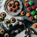 Bat Bites: Unwrap each Reese’s Cup. Separate Oreo cookies and scrape off the cream. Break each Oreo in half to form bat wings (be patient here; a lot will break!) Melt white chocolate chips in the microwave in bursts of 25 seconds, stirring between each burst until melted and smooth. Transfer to a resealable plastic bag, snip off a corner, and pipe small dots on the Reese’s for the bat wings. Attach one Oreo half to each side of the Reese’s Cup to resemble wings. Pipe a small amount of chocolate below the wings and secure candy eyeballs to the Reese’s Cup.