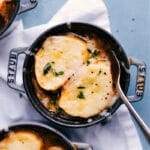 Storage: Keep onion soup (without the cheesy croutons) in an airtight container in the fridge for 3–5 days (depending on how fresh the chicken stock is). Freeze completely cooled leftover soup (without the croutons) for up to 3 months. Defrost overnight in the fridge; then heat through on the stovetop, adding extra stock as needed. Make the cheesy croutons fresh.