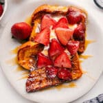Serve the French toast right off the griddle with fresh whipped cream and thinly sliced strawberries. Drizzle with caramel syrup and eat right away!