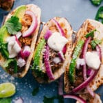 Storage: Store lime crema, pickled onions, pork, and toppings separately in airtight containers in the fridge; use within 1 week. Freeze cooled pork in a freezer-safe container and tortillas separately for up to 3 months.
