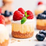 When ready to serve, add a spoonful of the strawberry sauce and a fresh berry (if desired) to the tops of the mini cheesecakes. Store any leftovers (sauce separate from the cheesecakes) in the fridge.