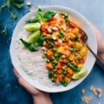 Remove curry from heat. If desired, serve curry over cooked rice. Garnish individual bowls with basil and coarsely chopped peanuts. I also like to serve lime wedges on the side. Serve over cooked rice with warmed roti bread. Enjoy!