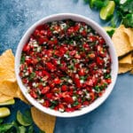 Note 1: The key to the best Pico de Gallo is the ripest possible tomatoes! Look for the ripest, reddest tomatoes and in the winter, use cherry tomatoes (which have the most consistent good flavor year-round). If not using cherry tomatoes, cut the tomatoes in half and scoop out the seeds and watery center before dicing. If using cherry tomatoes, chop into small pieces.Note 2: When preparing the jalapeño, you may want to wear gloves (or a plastic bag over your fingers) as it can burn your fingers/under fingernails. Wash your hands immediately after preparing/touching. Cut jalapeño in half and remove seeds. Coarsely chop to measure. Add more of the jalapeño for a spicier salsa, or add slowly if you prefer less heat. Wrinkly jalapeños are spicier than smooth ones.Storage: Leftovers can be stored in an airtight container in the fridge for up to 3 days. The longer it sits, the more the acidity will mellow, so you may want to add a fresh squeeze of lime juice and a touch more salt. It will also become more watery as it sits—drain off excess liquid.Make Ahead: Leave out the lime juice, olive oil, and salt (otherwise the tomato juices leach out excessively). Cover in an airtight container in the fridge. When ready to serve, drain off excess liquid. Add lime juice, olive oil, and salt right before serving.