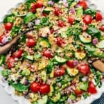In a large bowl, mix completely cooled quinoa and chopped spinach. Add tomatoes, cucumber, onion, avocado, and, if using, feta and herbs.If serving the same day: Add dressing to taste (as little or as much as you'd like).If meal prepping: Only dress the portion you plan to eat that day (see storage note below). Toss to combine, then taste and adjust with extra salt and pepper if needed. Serve right away.