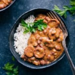 This Red Beans and Rice Recipe is comfort in a bowl! Creamy sauce, hearty red beans, andouille sausage, and veggies make it super filling and flavorful!