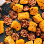 This easy three-ingredient Roasted Sweet Potato and Sausage with Pesto is a sheet pan meal made in no time! Roast sweet potato gnocchi and chicken sausage, then toss with fresh basil pesto.