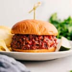 Note 1: Depending on the tomatoes and ketchup (some are sweeter than others), you may want more or less brown sugar.Note 2: To toast the buns, spread softened butter on the inside and place them in a dry nonstick pan over medium-high heat for 1–3 minutes, until golden.Storage: Store the meat in a sealed container in the fridge for 3–5 days or freeze for up to 3 months. Reheat on the stove or in the microwave until hot. Keep buns separate and toast just before serving.