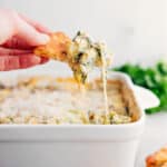Note 1: Grab a block of Parmesan cheese and grate it on the small holes of your box grater.Note 2: I love serving this dip with pita chips. Tortilla chips, veggie sticks, pretzels, and toasted baguette slices are also great options.