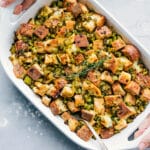 Note 1: I find the fresh poultry herb blend mix by other packaged fresh herbs in the refrigerated produce section of the grocery store. Fresh poultry blend typically includes sage, thyme, and rosemary. For this recipe, use 2 tbsp fresh sage, 1-1/2 tbsp fresh thyme, and 1 tbsp rosemary.For make-ahead: To prepare ahead, dry out the bread and store in an airtight bag at room temp. Follow step #3, then store in the fridge. Continue with step #4 the next day, adding bake time if needed.Storage: Best eaten fresh. Store leftovers in an airtight container in the fridge for up to 4 days or freeze for up to 1 month.